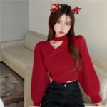 Black Acrylic Knit Halter Neck Sweater With Lantern Sleeves
