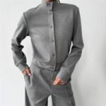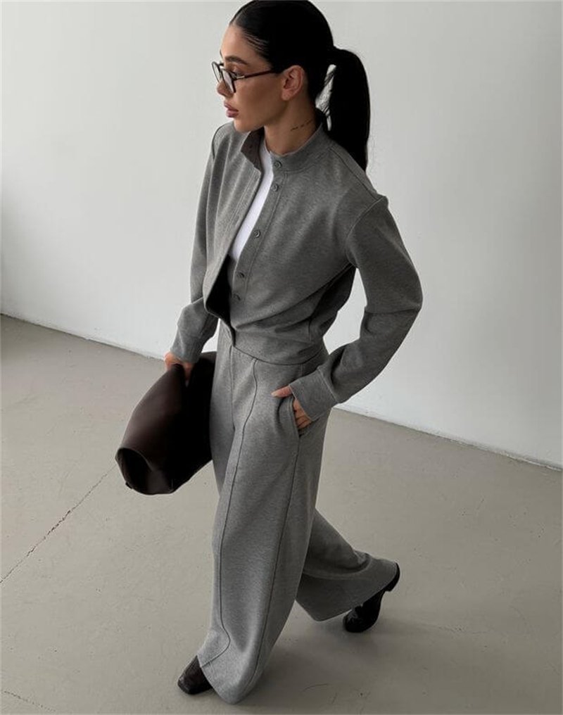 Grey Crew Neck Button-Down Cardigan And Trouser Suit