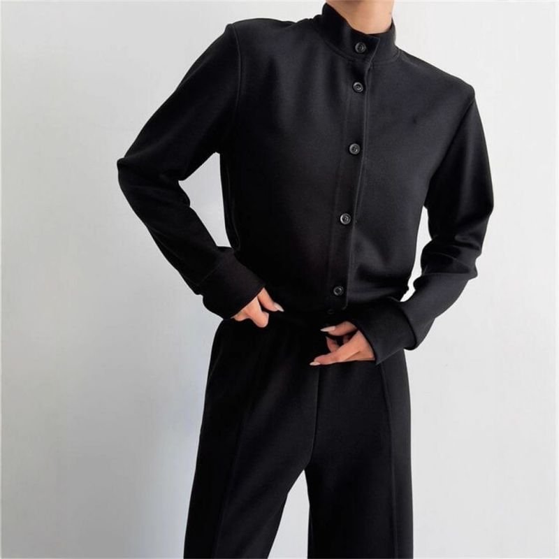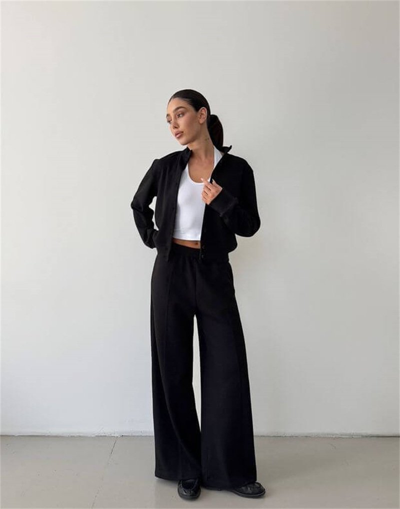 Black Polyester Button-Down Collar Sweatshirt And Trousers Set