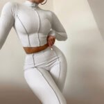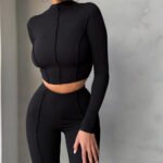 Black Polyester Knitted Stand Collar Sweater And Trousers Set