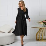 Black Polyester V-Neck Lace-Up Maxi Skirt