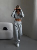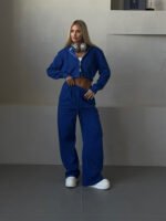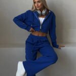 Blue Blended Long-Sleeved Hooded Cardigan And Trousers Set