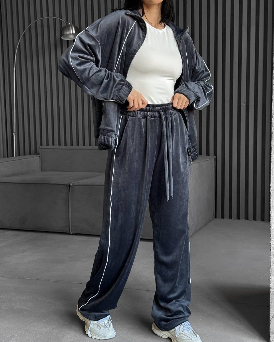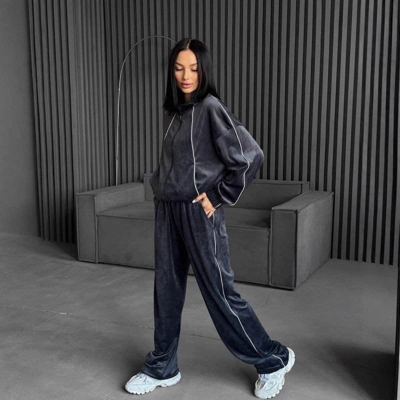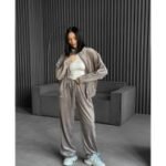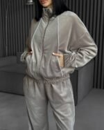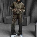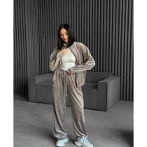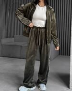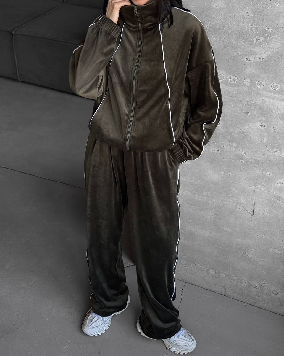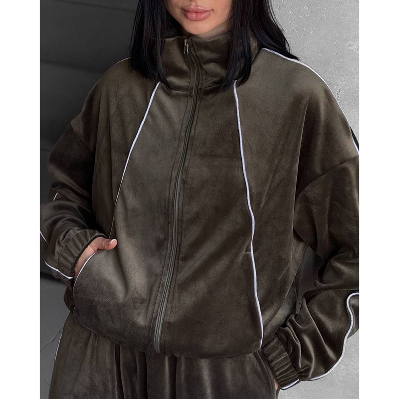 Coffee Brown Velvet Stand-Up Collar Zip-Up Jacket And Trousers Suit