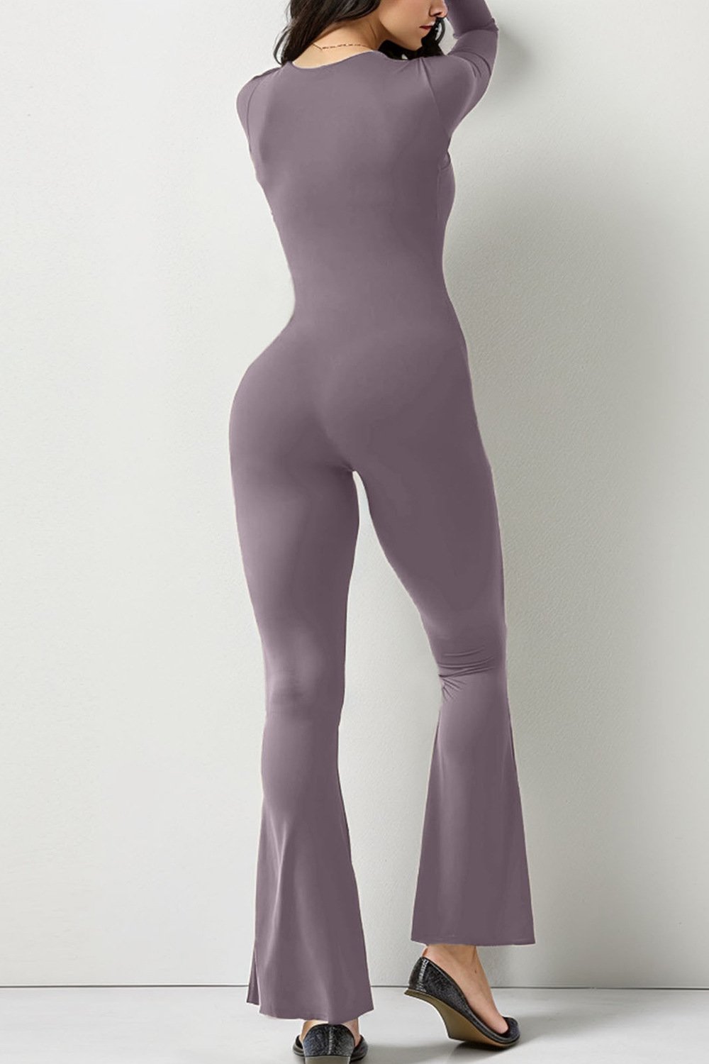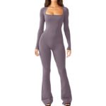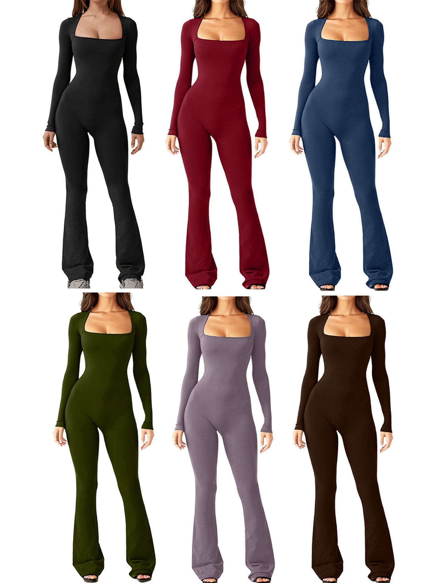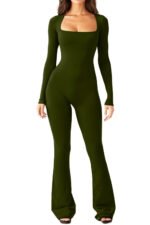 Dark Brown Long-Sleeved Square-Neck Waisted Jumpsuit