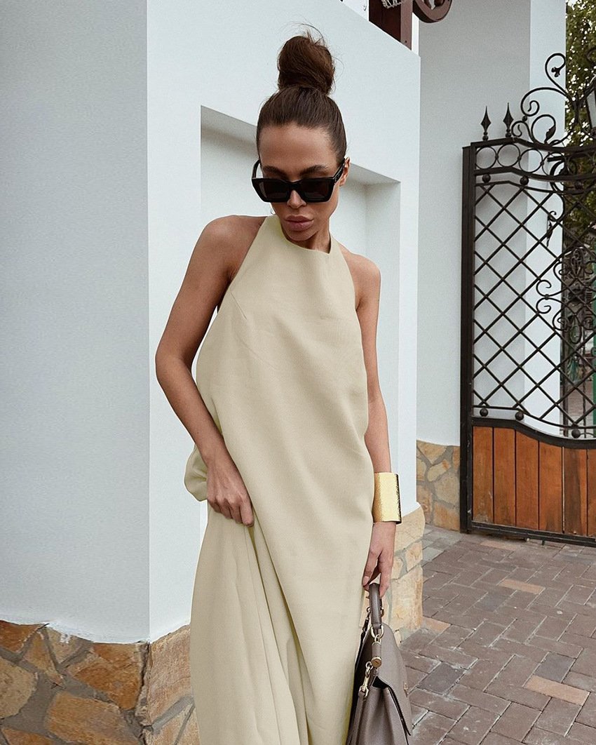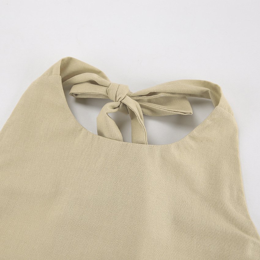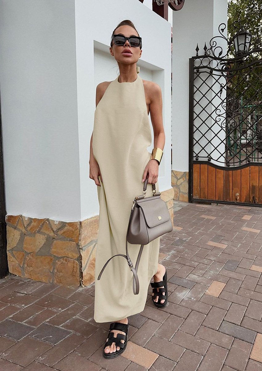 Khaki Cotton And Linen Halterneck Maxi Dress