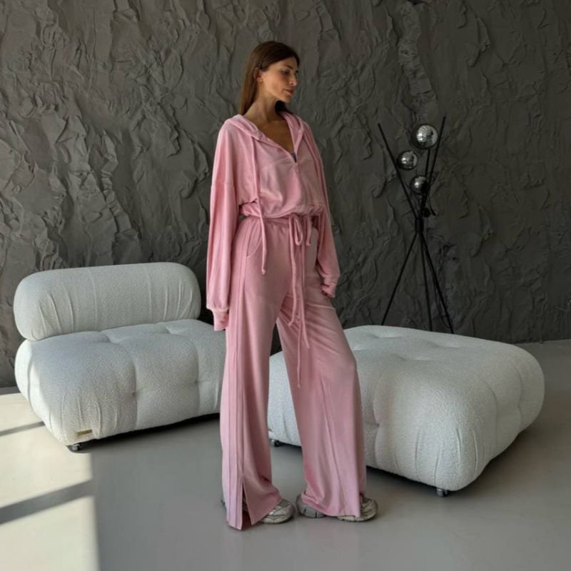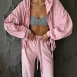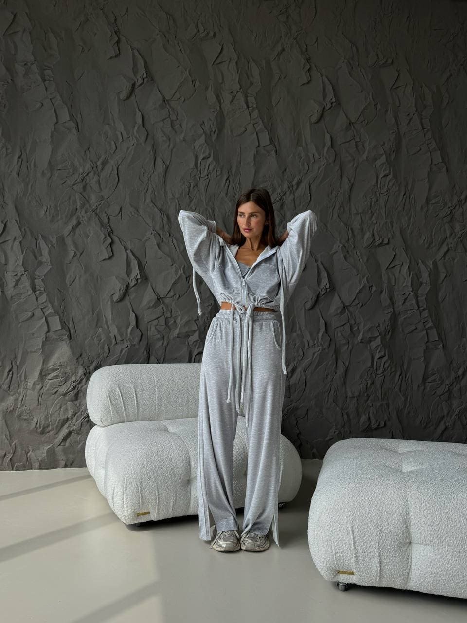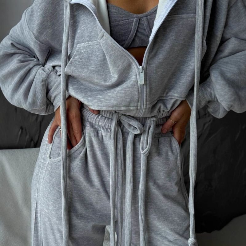 Light Gray Polyester Zipper Hooded Jacket And Drawstring Trousers Set