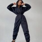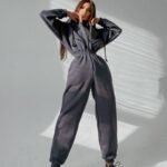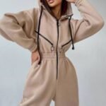 White Blended Fabric Zip-Up Hooded Sweatshirt Jumpsuit