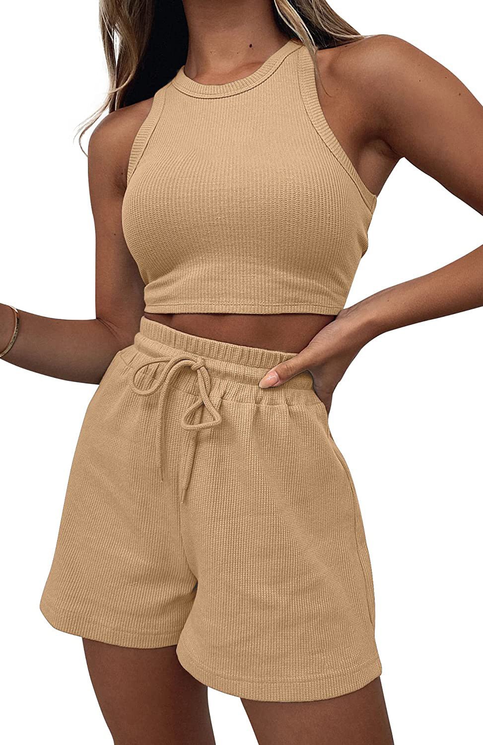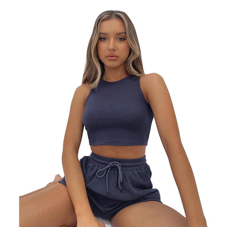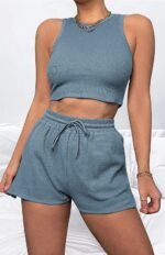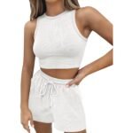White Waffle-Knit Crew Neck Vest And Tie-Up Shorts Set